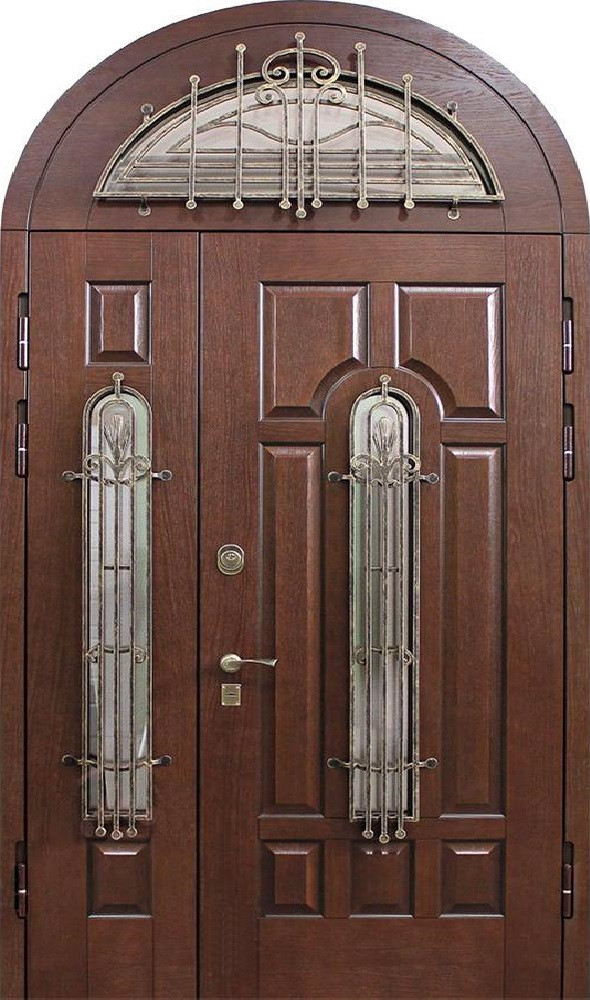 Арочные конструкции всегда придают входу выразительность и особый статус, а если добавить две створки и стеклянные вставки, дверь превращается в центральный элемент фасада. Натуральное дерево в отделке подчеркивает солидность и гармонично сочетается с металлом, из которого выполнено основание: каркас и полотно из профильных труб и стальной лист толщиной 2 мм обеспечивают прочность и долговечность. Для удобства и безопасности используются два замка разного типа — сувальдный и цилиндровый, оба с тремя ригелями, что делает взлом крайне затруднительным. Двухстворчатая арочная дверь со стеклом в частный дом №14 может изготавливаться любого размера и адаптироваться под архитектуру конкретного здания. Возможна установка дополнительных элементов: зеркало, стеклопакет, кованые детали или даже видеодомофон. Резиновое уплотнение по двум контурам защищает от сквозняков, а возможность выбора отделки и фурнитуры открывает простор для индивидуального дизайна. Двухстворчатая арочная дверь со стеклом в частный дом №14 от производителя: быстрое изготовление и монтаж в Озерах, индивидуальные размеры, широкий выбор материалов и фурнитуры, официальная гарантия до 10 лет.