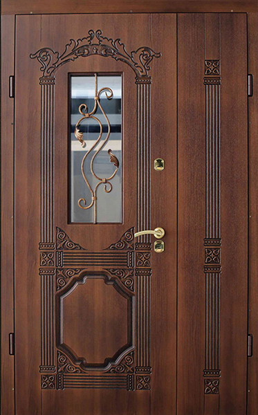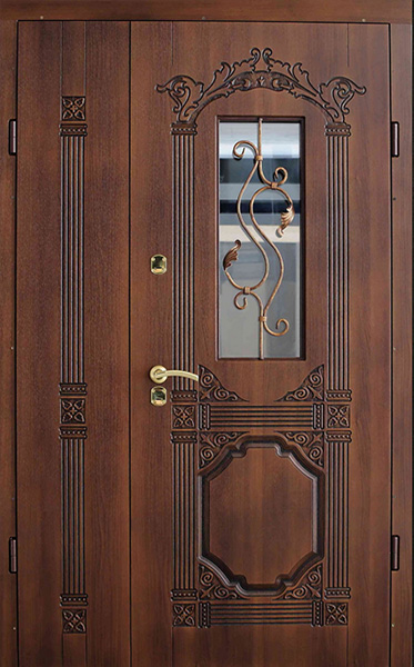 Уличная двухстворчатая дверь со стеклом и кованой решеткой №26 — это не только надежная защита для вашего дома, но и элемент, который подчеркнет его стиль и индивидуальность. Внешняя отделка из МДФ с ПВХ обеспечивает долговечность, устойчивость к внешним воздействиям и сохранение эстетического вида на долгое время. Добавление кованой решетки и стеклопакета придает двери элегантности, а также улучшает светопропускание, создавая комфортное освещение в вашем помещении. Уличная двухстворчатая дверь со стеклом и кованой решеткой №26 от производителя: быстрое изготовление и монтаж в Озерах, индивидуальные размеры, широкий выбор материалов и фурнитуры, официальная гарантия до 10 лет.