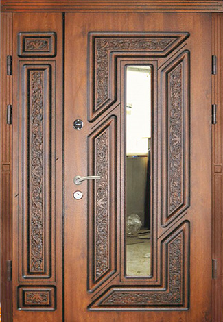 Дизайнерская входная дверь в частный дом с отделкой под дерево и решеткой №17