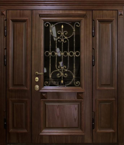 Входная металлическая дверь с порошковым покрытием, стеклом и ковкой в частный дом №27 — это не только надежность, но и стильное решение для вашего коттеджа или частного дома. Массив дерева, использованный в отделке снаружи и внутри, придаёт двери тепло и элегантность, в то время как прочная металлическая конструкция с профильной трубой и листом металла толщиной 2 мм обеспечивает долговечность и защиту. Стекло и кованые элементы добавляют изысканности, а порошковое покрытие защищает от внешних воздействий, сохраняя первоначальный вид. Терморазрыв в коробке и полотне помогает минимизировать теплопотери, а эффективная система уплотнения с двумя контурами гарантирует уют и тишину в вашем доме. Входная металлическая дверь с порошковым покрытием стеклом и ковкой в частный дом №27 от производителя: быстрое изготовление и монтаж в Озерах, индивидуальные размеры, широкий выбор материалов и фурнитуры, официальная гарантия до 10 лет.